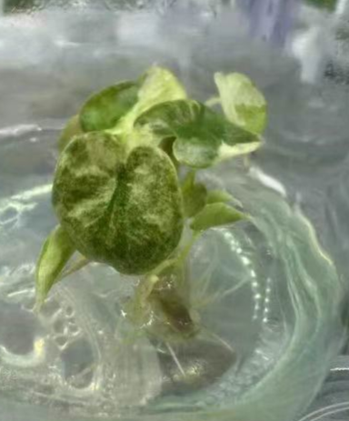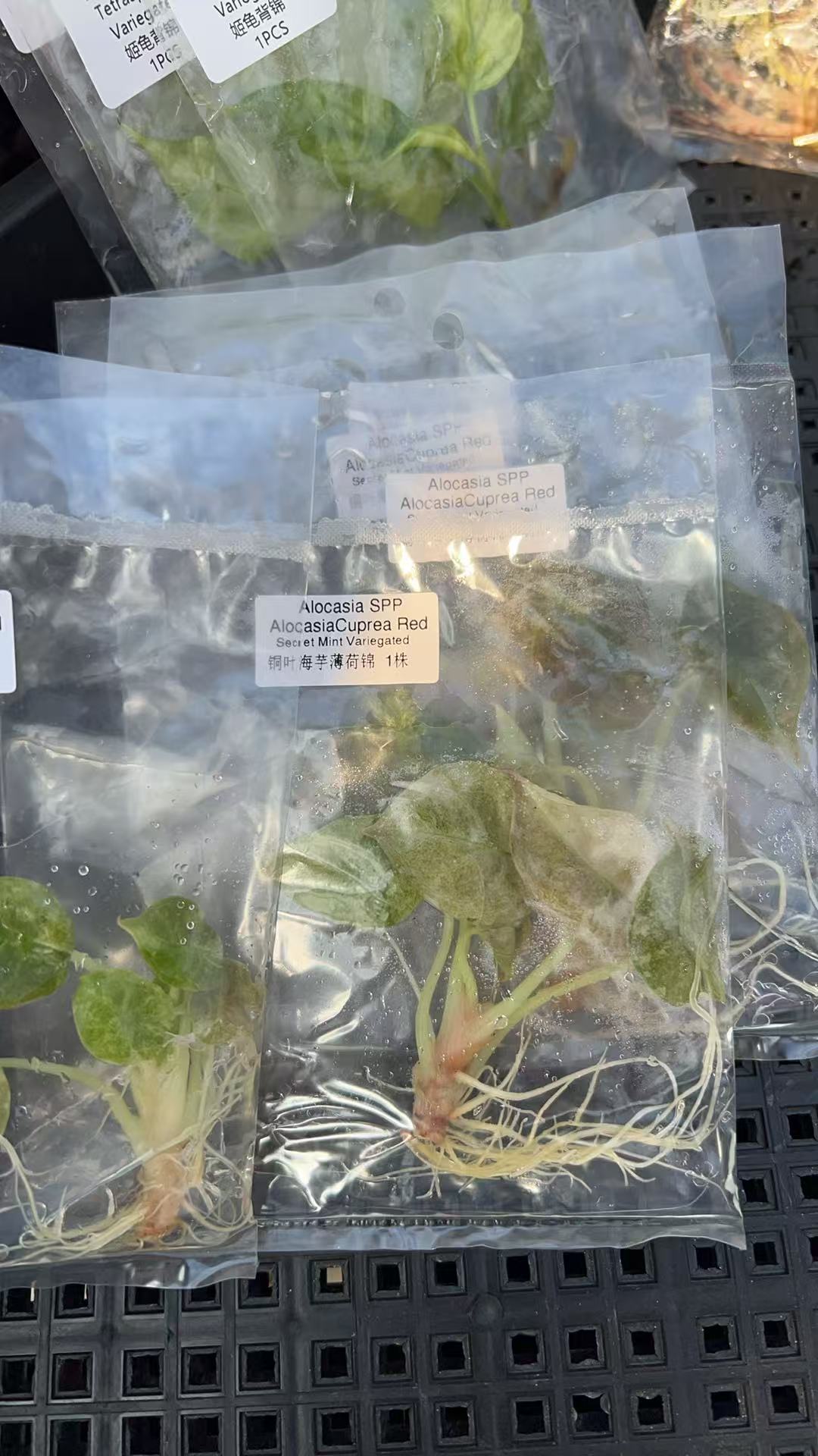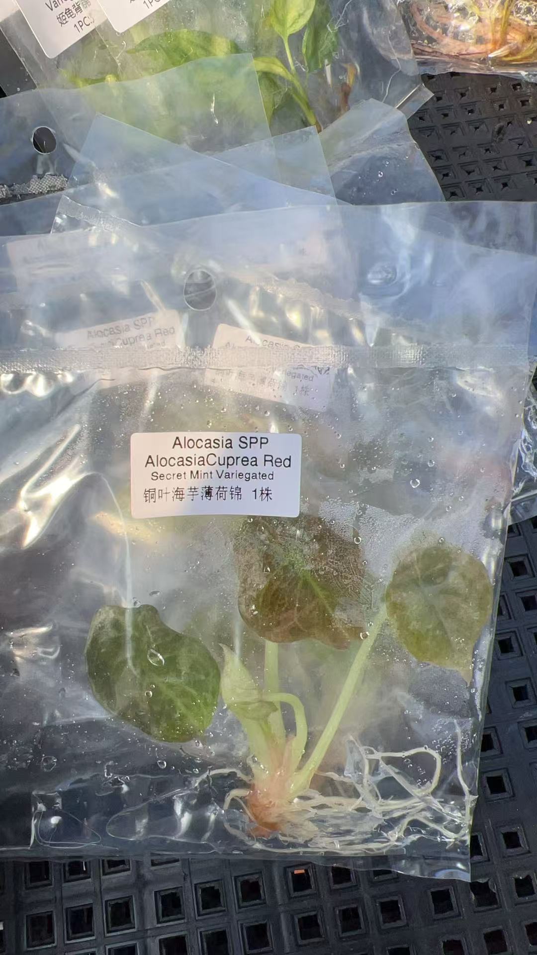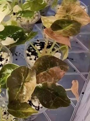 Alocasia Cuprea 'Red Secret' variegated is prized for its deeply hammered, iridescent burgundy-red leaves. It combines three highly sought-after traits: copper-toned metallic foliage accented with fresh mint green and pink variegation. Each leaf displays a unique pattern, ranging from spots and splashes to bold half-moon sectors. Propagated through sterile tissue culture, these young plantlets ensure pure genetics and excellent health, providing growers with a clean, vigorous start.