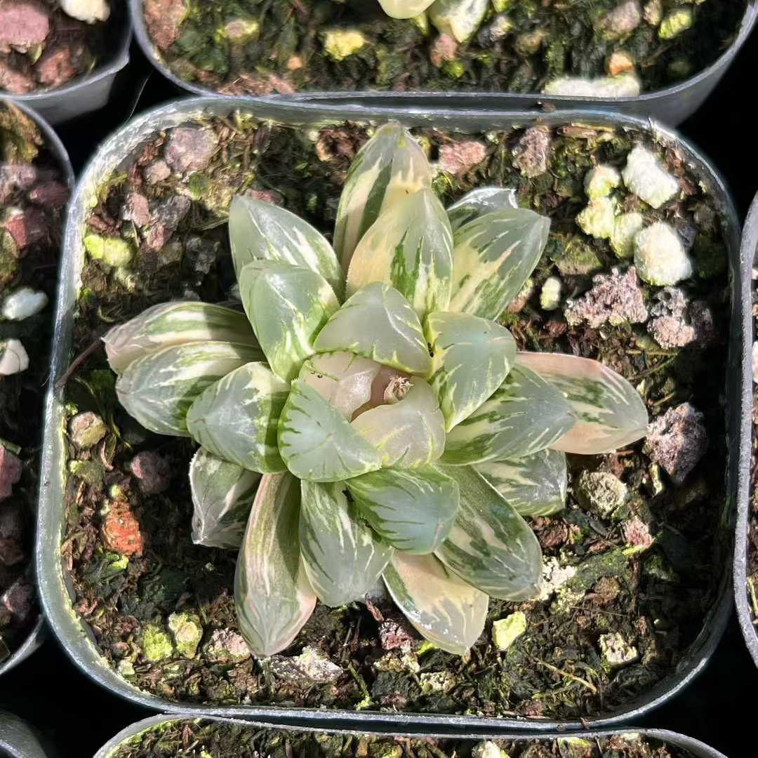 Min Hui Haworthia MintBlush features translucent leaves blended with soft mint green and creamy blush tones. The compact symmetrical rosette and stable variegation make it suitable for premium trays, mixed succulent collections, and wholesale distribution. Seasonal light may influence pink and cream saturation. For wholesale pricing and more plant varieties, please contact us directly.