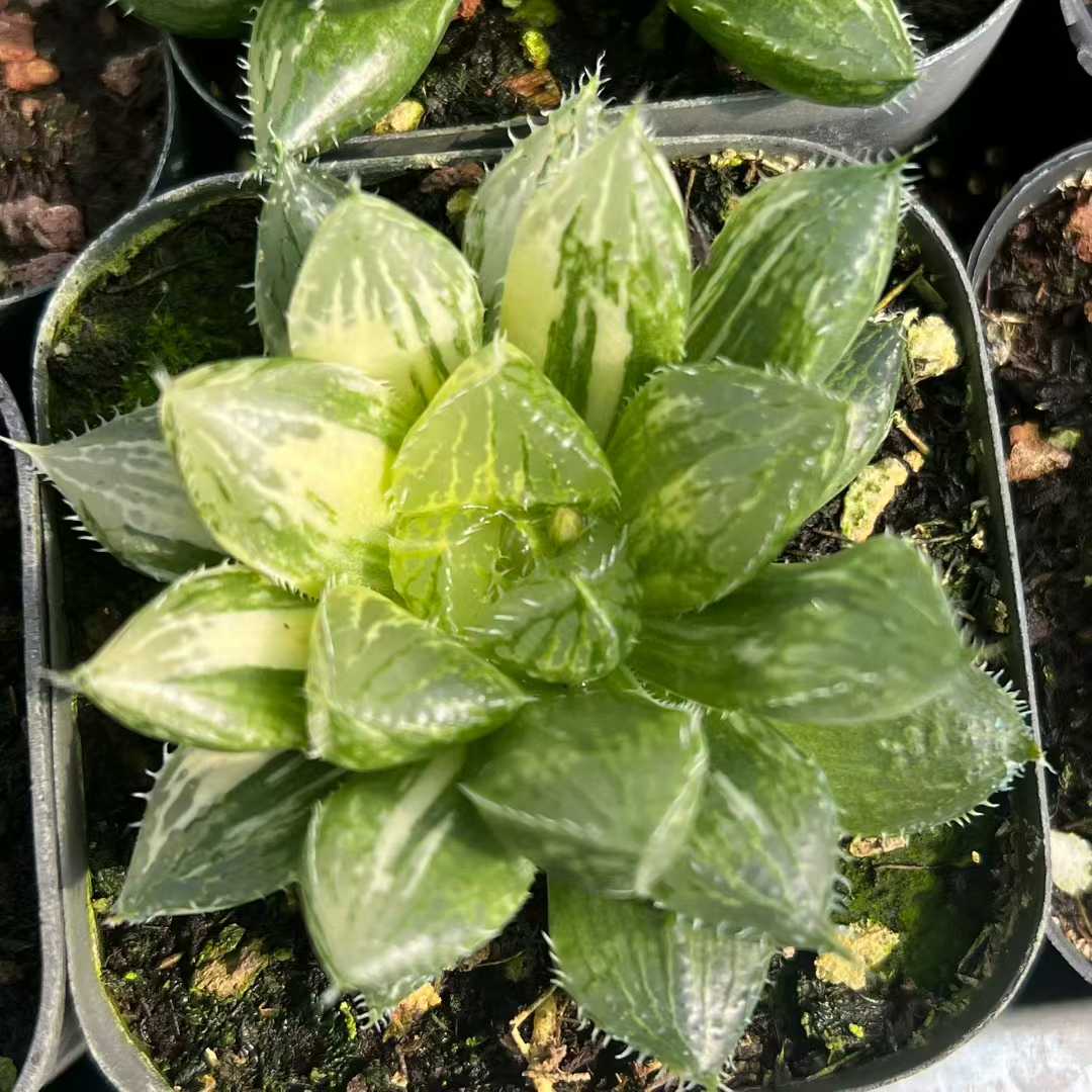Min Hui Haworthia SnowEdge features translucent green leaves highlighted with creamy white patches and fine soft marginal teeth. The compact symmetrical rosette and stable variegation make it ideal for small pots, premium trays, and wholesale succulent collections. Light intensity may enhance contrast and clarity. For wholesale pricing and more plant varieties, please contact us directly.