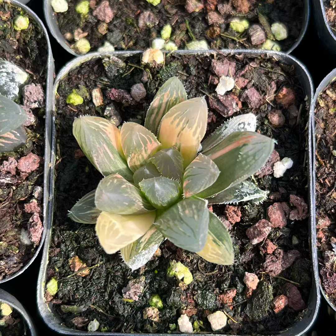 Min Hui Haworthia SunsetStripe is characterized by its warm-toned variegation combining peach, cream, and green over translucent leaf surfaces. The thick triangular leaves form a tight, balanced rosette with refined texture and layered color transitions. Under bright indirect light, the warm hues intensify, creating a soft sunset-like gradient effect.