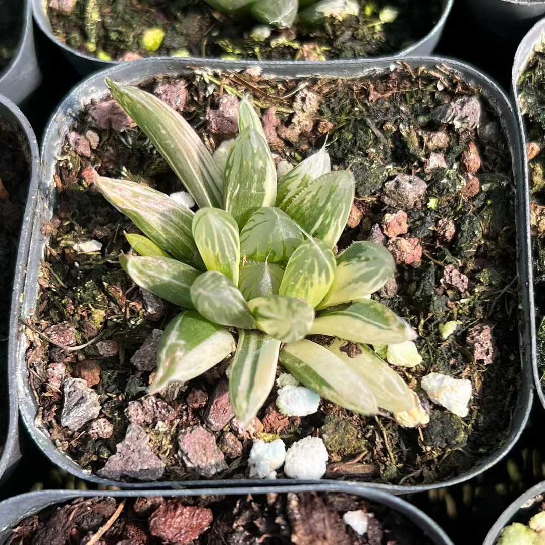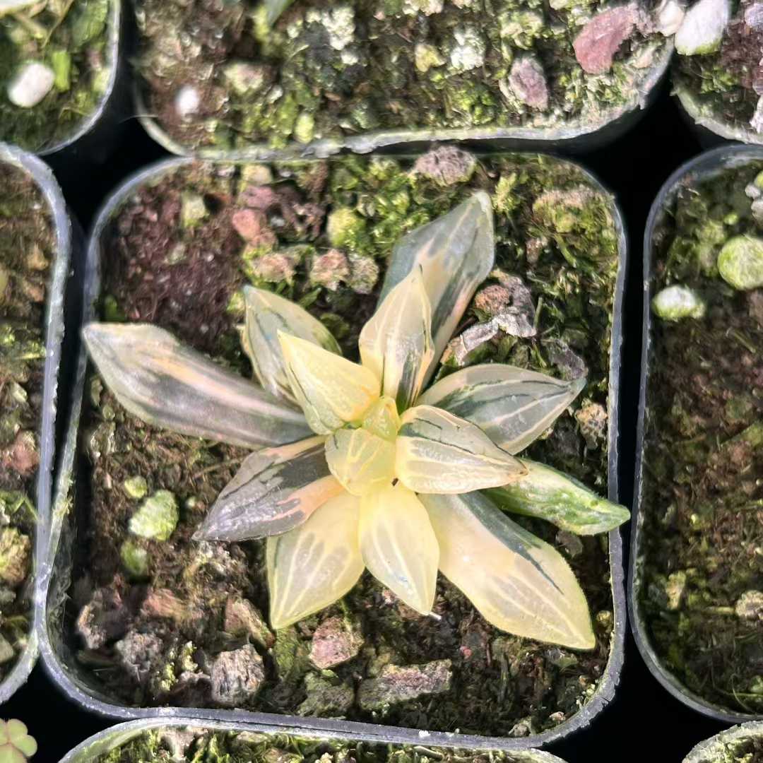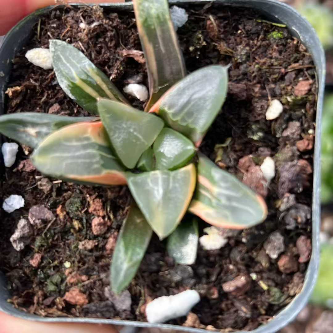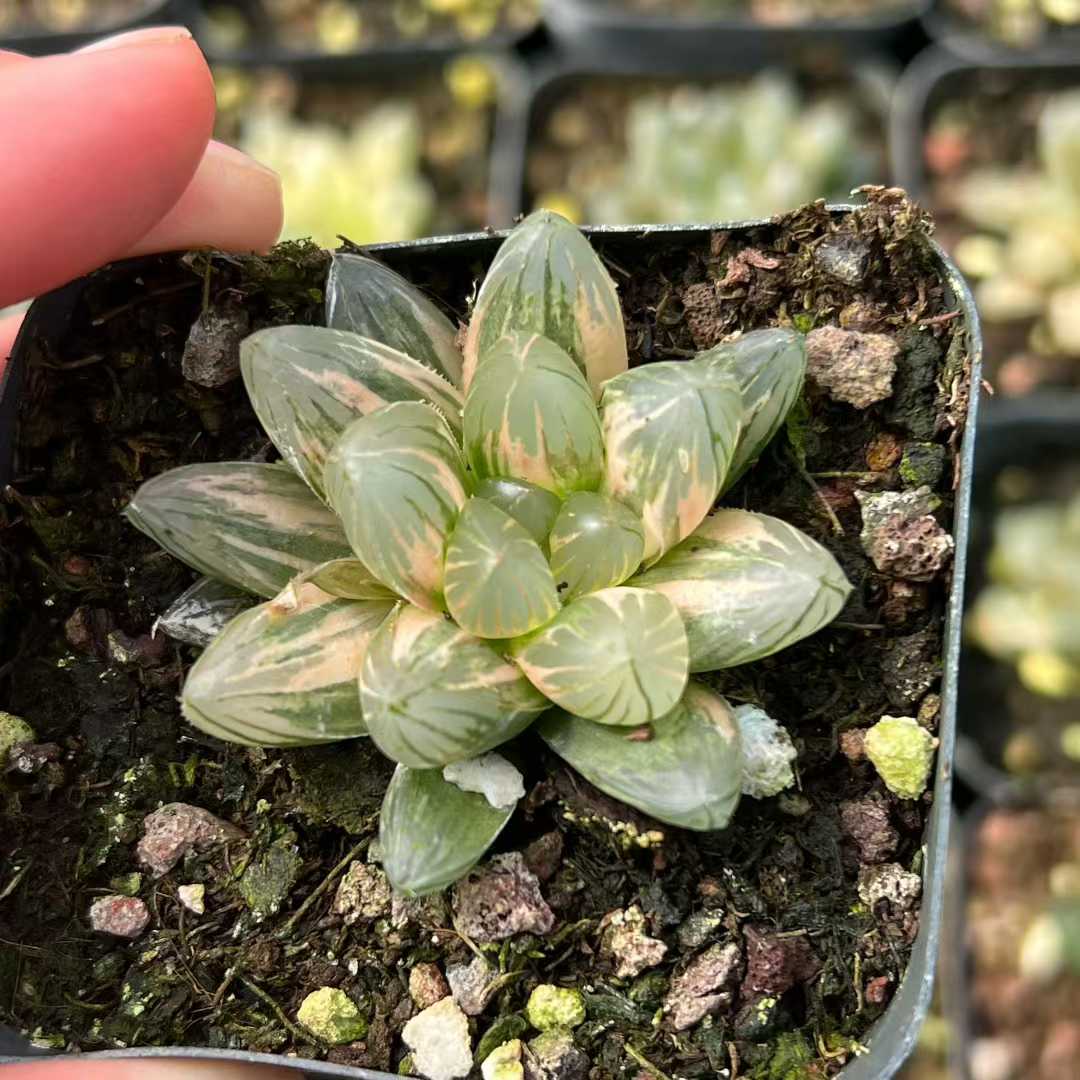 Min Hui Haworthia SunsetStripe features translucent leaves blended with warm peach, creamy yellow, and deep green striping. The compact rosette form and stable variegation make it suitable for collector trays, mixed succulent assortments, and wholesale distribution. Seasonal light intensity may enhance orange and cream tones. For wholesale pricing and more plant varieties, please contact us directly.