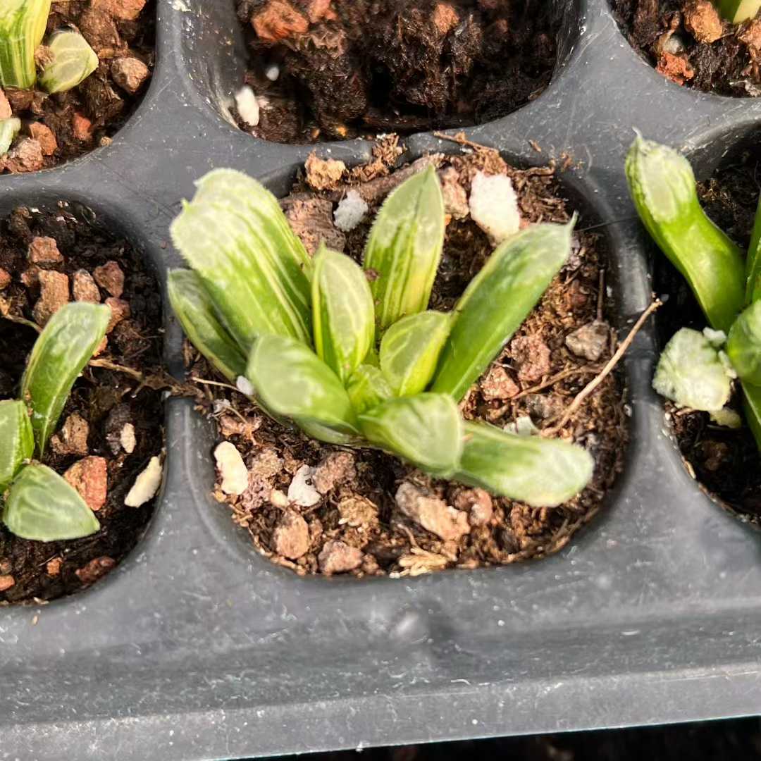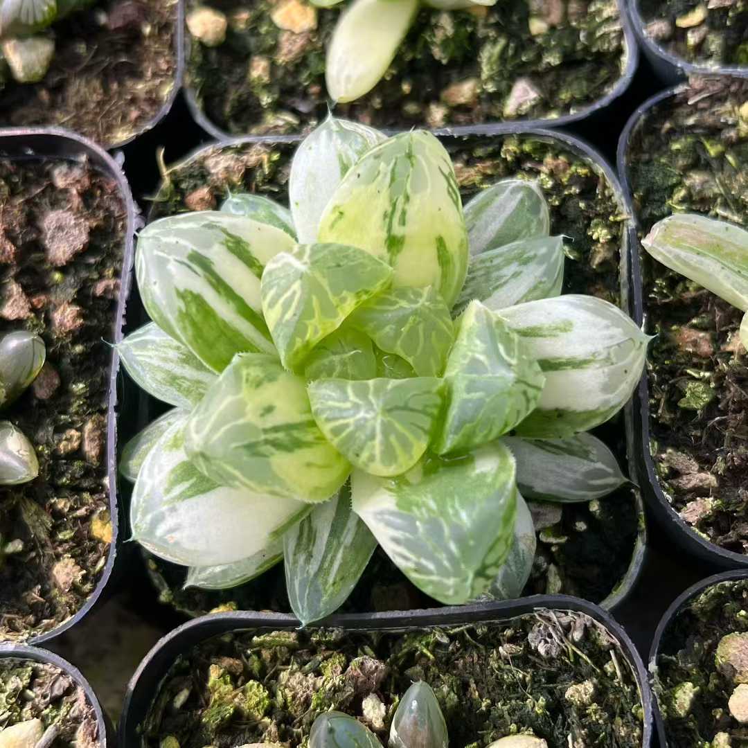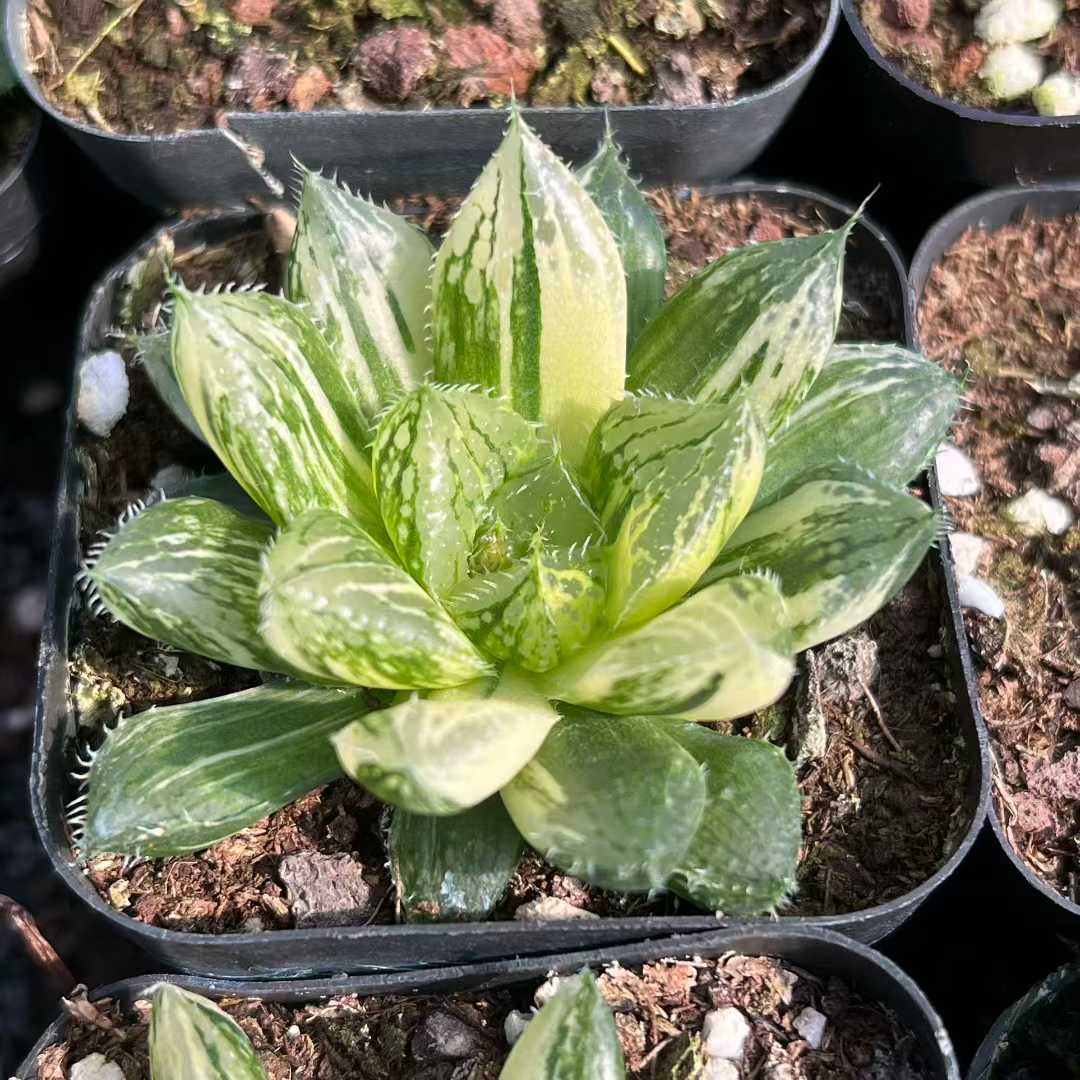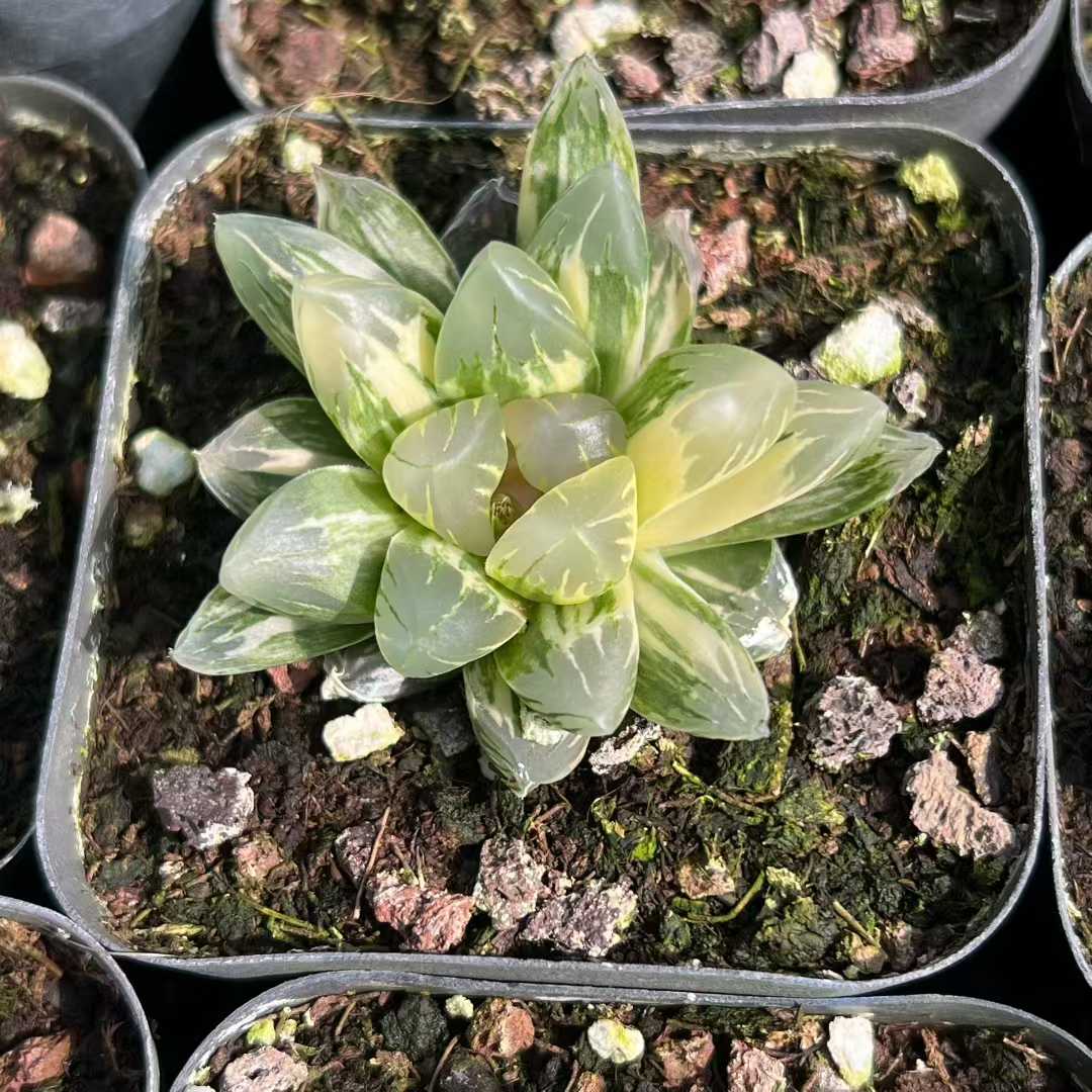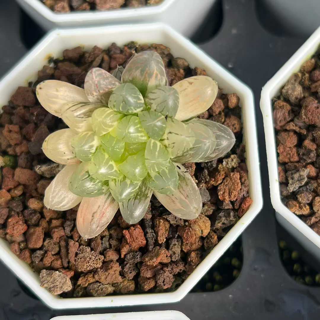 Min Hui Haworthia SunsetStripe features translucent leaves blended with warm peach, creamy yellow, and deep green striping. The compact rosette form and stable variegation make it suitable for collector trays, mixed succulent assortments, and wholesale distribution. Seasonal light intensity may enhance orange and cream tones. For wholesale pricing and more plant varieties, please contact us directly.